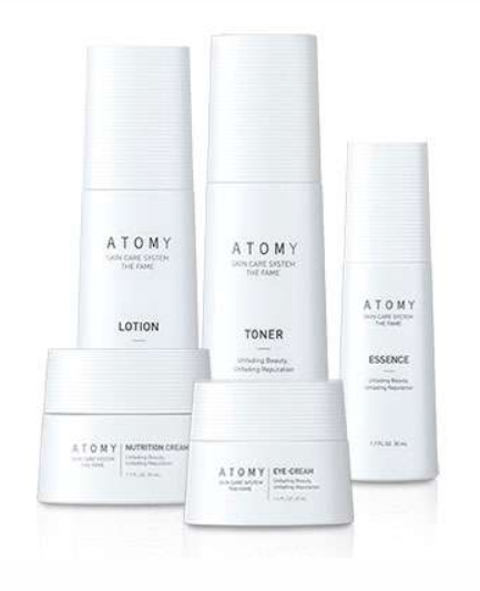 Пятиступенчатая система по уходу за кожей Фэйм от Atomy. Включает в себя: тонер, крем для кожи вокруг глаз, эссенцию, лосьон, питательный крем.