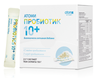 АТОМИ ПРОБИОТИК 10+ – Богатое содержание разнообразных лактобактерий, помогает с проблемами ЖКТ и улучшает пищеварение. Организм обогатится полезными бактериями и избавится от вредных. В одном саше (2.5 г) содержится целых 3 млрд лактобактерий.